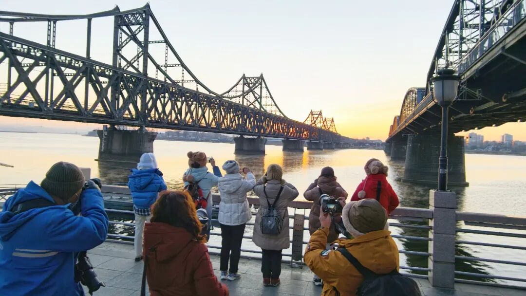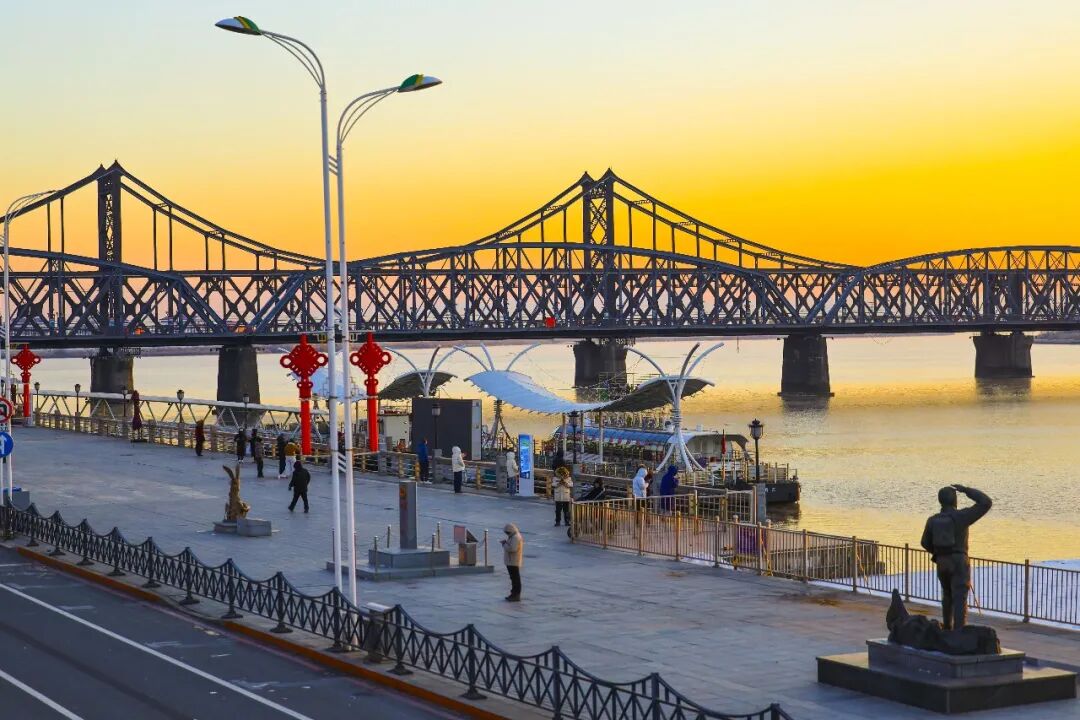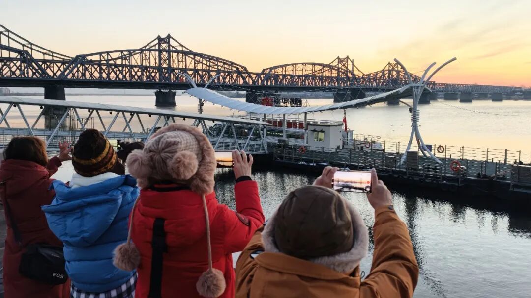 동쪽 하늘이 서서히 밝아지며 붉은 해가 지평선 위로 천천히 모습을 드러냈다. 해빛은 먼저 압록강 다리들을 비추고, 이어 강물 우로 고르게 퍼져 나갔다. 유람선 부두에 정박한 관광선들은 새벽 빛 속에서 더욱 눈에 띄였다.