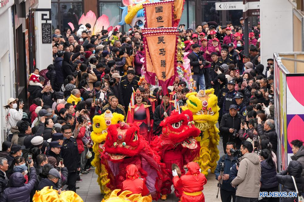 [신화망 중국 우시 2월 26일] 25일 메이춘 태백 묘회에서 퍼포먼스를 선보이는 공연자들.