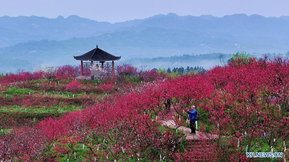 [신화망 북경 3월 6일발] 사천성 남충시 봉안현에서 관광객들이 유람선을 타고 꽃구경을 하는 모습이 5일 무인기의 촬영사진에 담겼다.