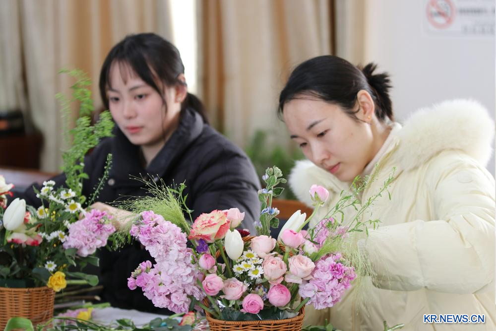 7일 호북성 무한시 려객운수 한구승무중심에서 고속렬차 승무원들이 꽃꽂이를 배우고 있다.