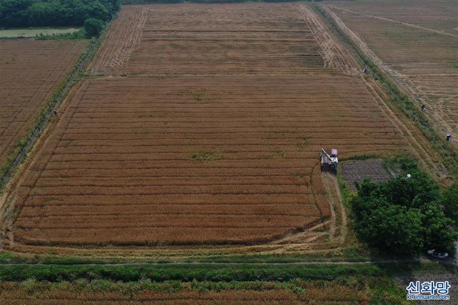 5월24일, 저장성 후저우(湖州)시 우싱(吳興)구 바리뎬(八里店)진 소재 한 전문 합작사의 보리밭에서 농민이 콤바인으로 보리를 수확하고 있다. (드론 사진)[촬영/신화사 기자 황쭝쯔(黃宗治)]