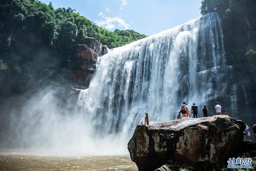 6월 15일, 유람객이 츠수이(赤水)대폭포관광구에서 유람하고 있다. 6월 15일, 날씨가 화창하고 폭포 수량이 풍부한 구이저우(貴州)성 츠수이(赤水)시 츠수이대폭포관광구에 많은 유람객이 찾아와 즐거운 시간을 보냈다. [촬영/ 신화사 기자 타오량(陶亮)]