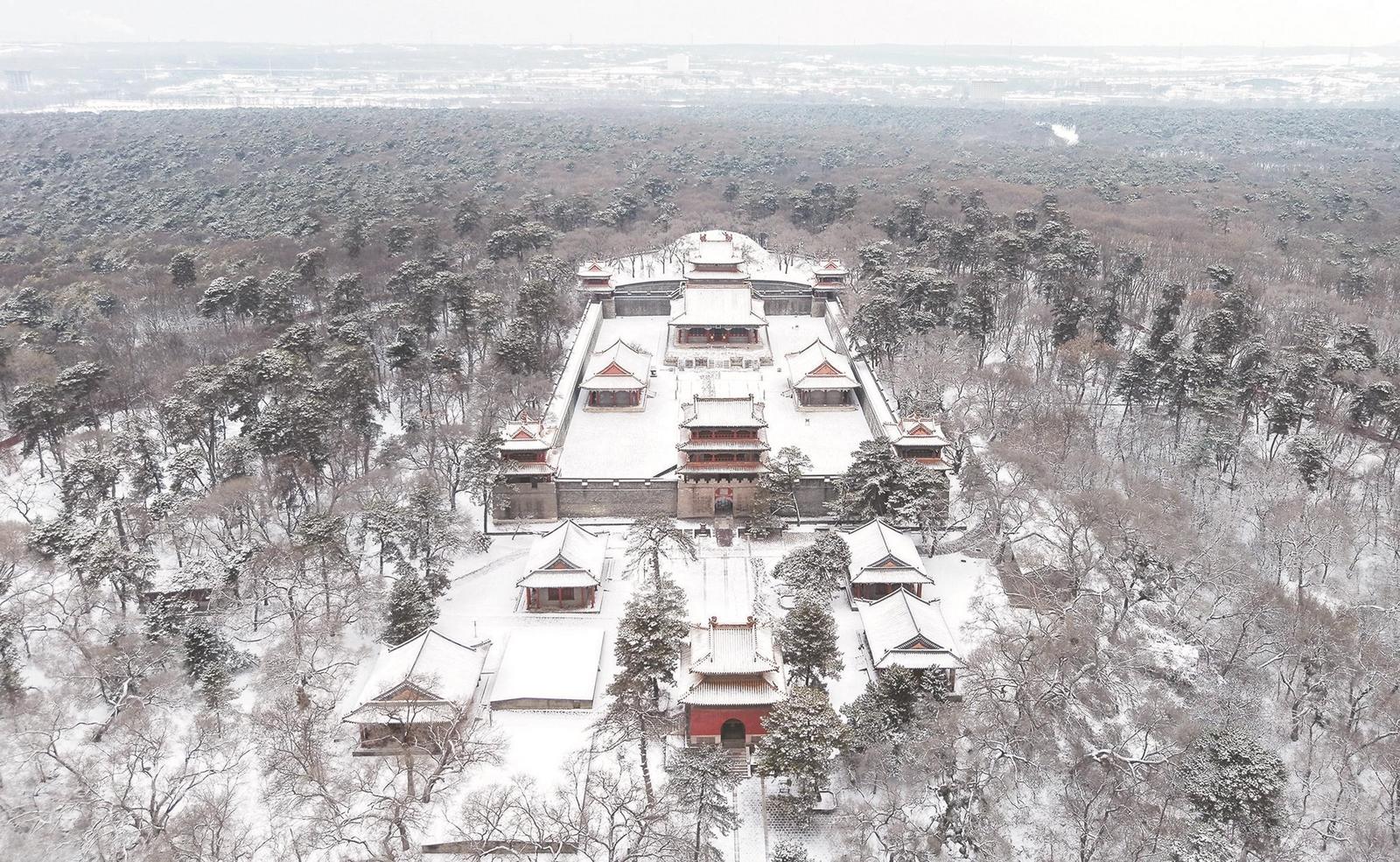 11월 27일, 눈이 내린 뒤의 심양 동릉공원은 은빛 단장을 해 아름다운 경치를 선보였다. 붉은 담벼락과 하얀 눈이 선명한 대조를 이루었고 유리기와 우에 살짝 덮인 눈이 해빛에 반짝이고 있다. 공원내 오래된 건축물들은 흰눈 아래에서 장중하고 신비로운 매력을 뽐내며 겨울 절경을 보여주었다.