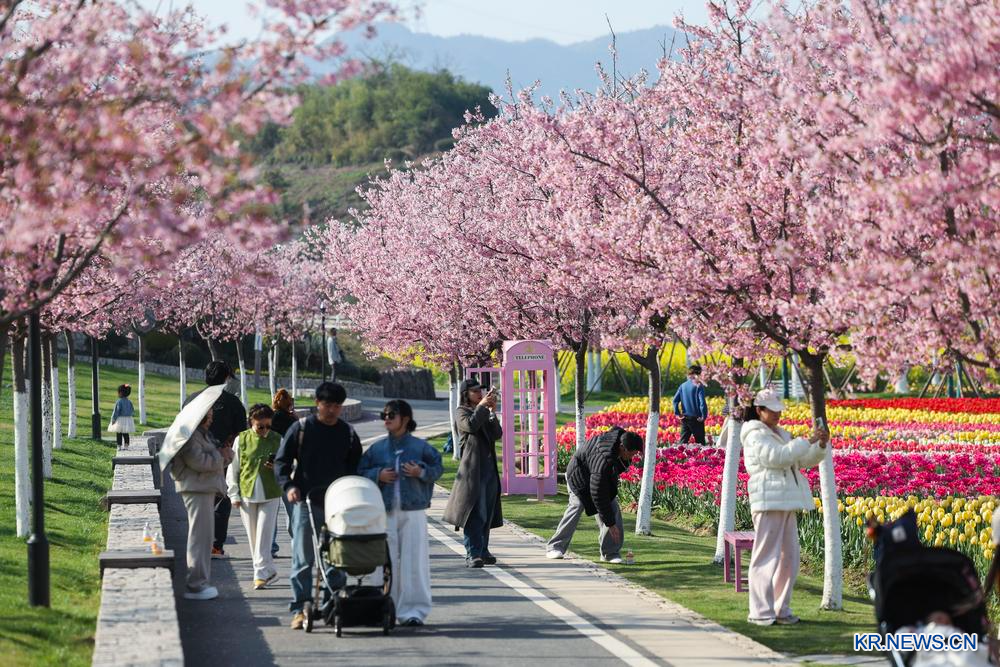 [신화망 중국 금화 3월 11일발] 화전미지 관광지는 절강성 금화시 무의현에 위치한 농촌관광대상이다. 최근 관광지내 황금빛 유채꽃과 분홍빛 벚꽃, 형형색색의 튤립 등이 어우러져 관광객들의 발걸음이 이어지고 있다.