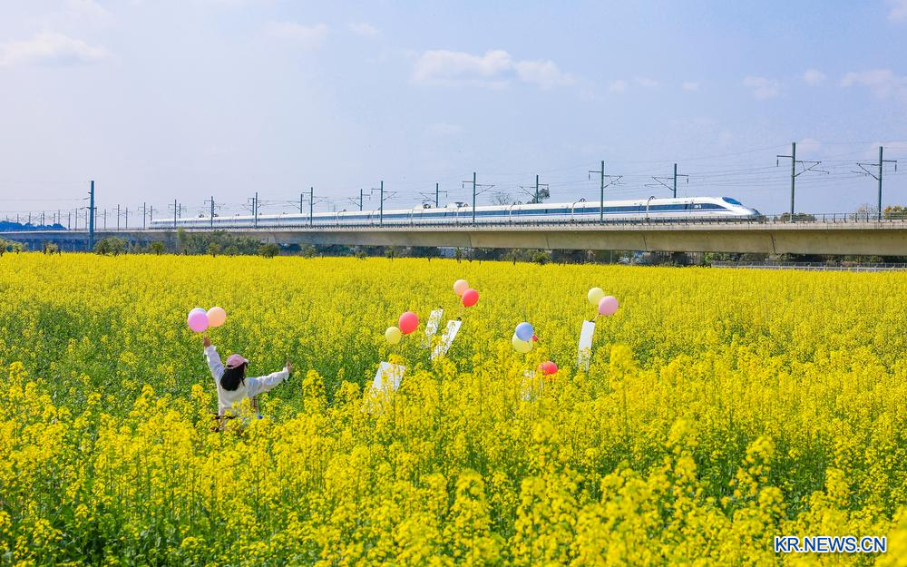 [신화망 북경 3월 18일발] 지난달 26일 관광객들이 사천성 로주시의 한 밭에 피여난 유채꽃을 감상하고 있다.