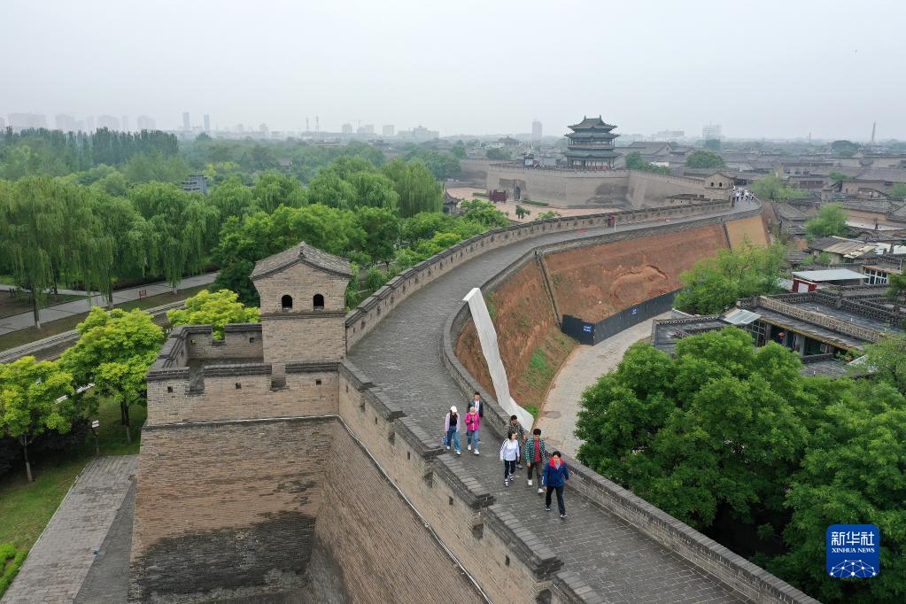 游客在平遥古城城墙上游览(5月30日摄,无人机照片)。