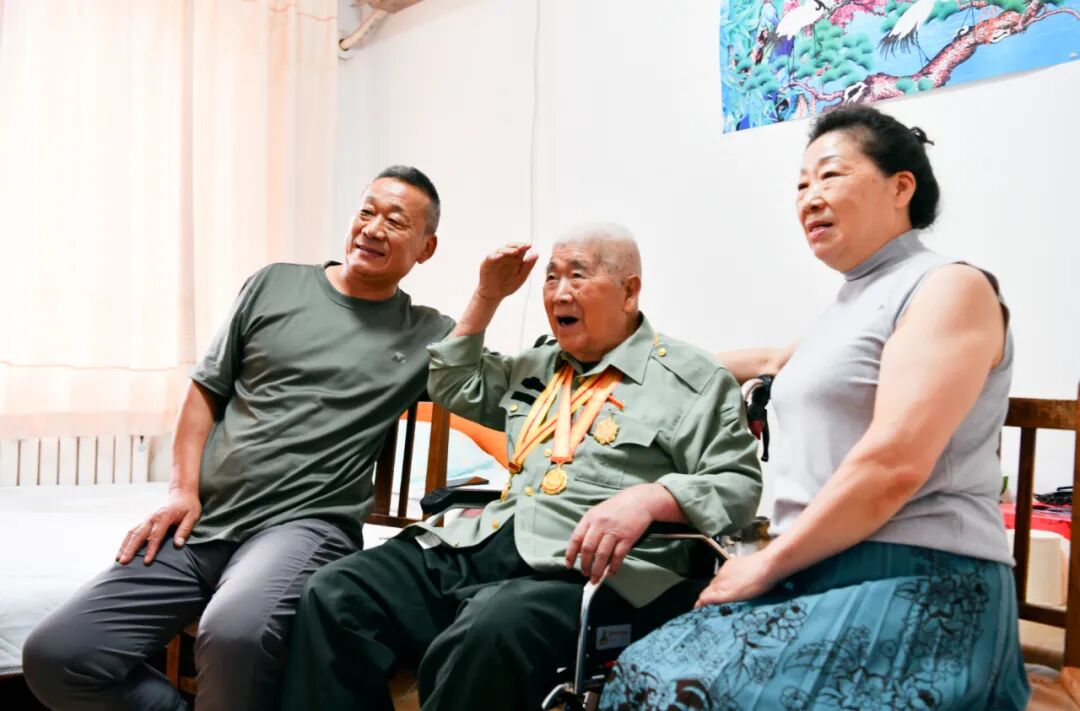 在辽宁省军区丹东第三离职干部休养所,参加过抗日战争、解放战争和抗美援朝战争,98岁的离休干部潘福全和子女一起收看纪念大会。