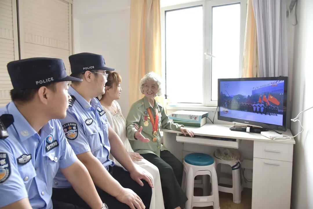 振兴区临江街道东昇社区党委联合临江边境派出所、市老年服务协会来到抗美援朝老兵刘吉慧家中,共同观看纪念大会。