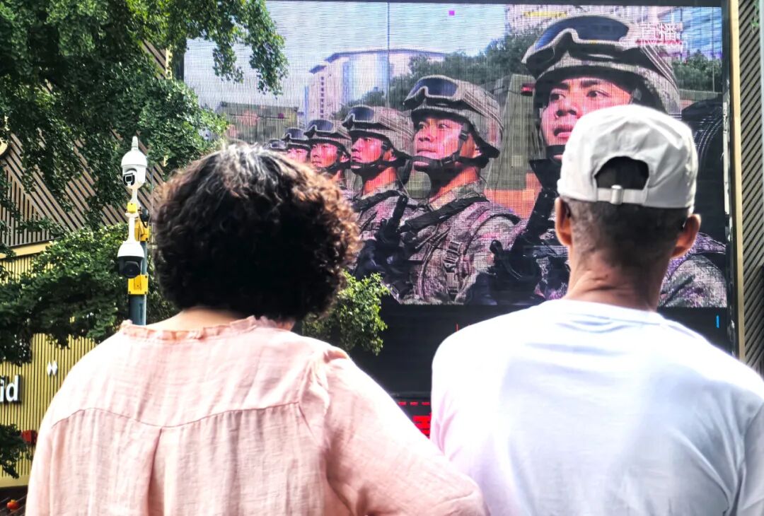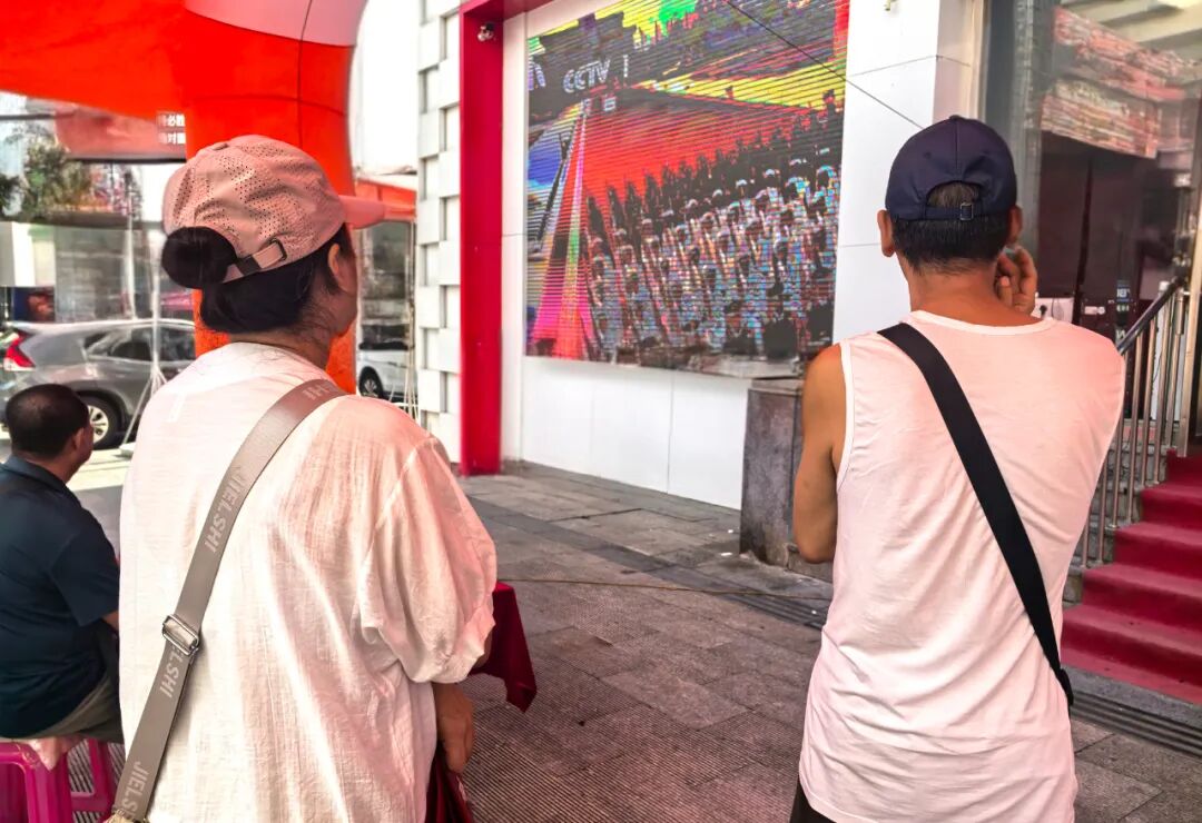 新安街旁一家电器店外,市民驻足观看纪念大会。