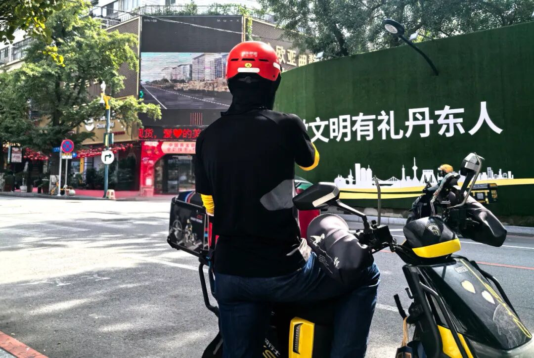 一位外卖小哥在送餐间隙驻足观看纪念大会