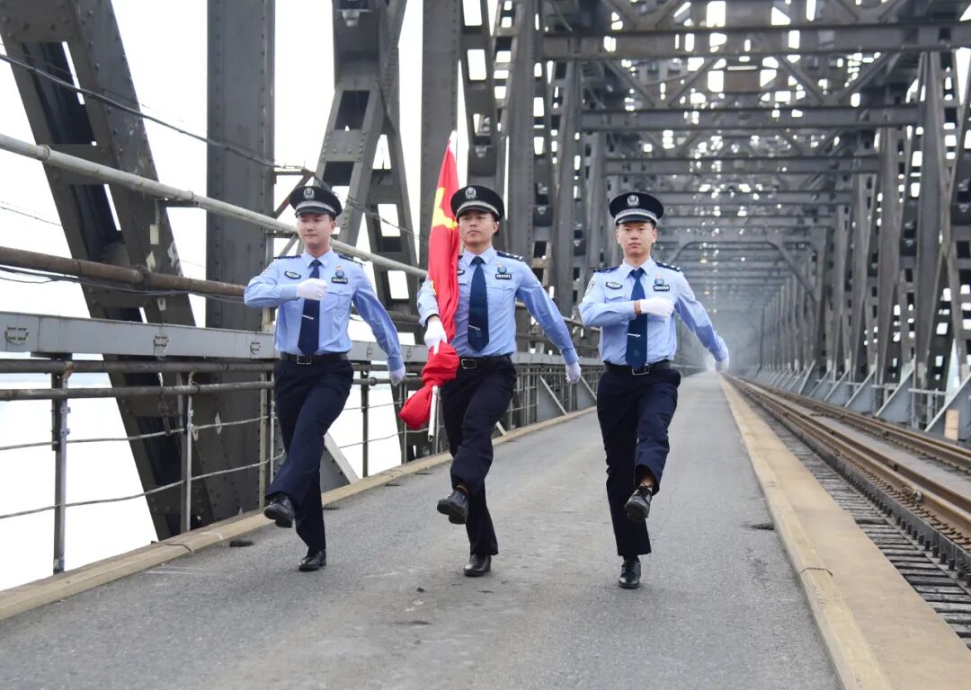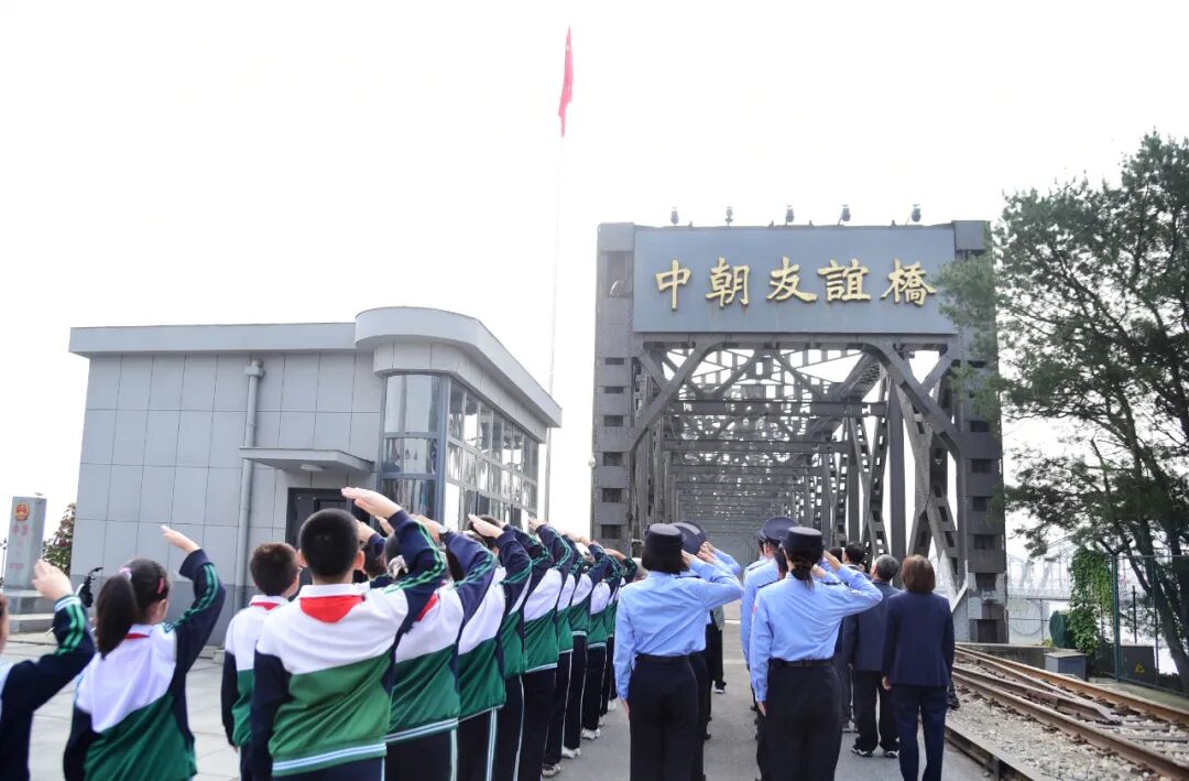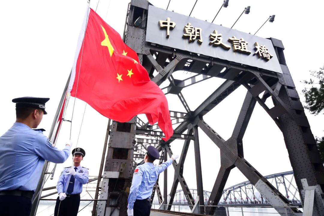 清晨,丹东出入境边防检查站在中朝友谊桥上举行升国旗仪式,庆祝中华人民共和国成立76周年。抗美援朝志愿军老战士、金汤小学师生和市关工委的代表,应邀参加升国旗仪式。