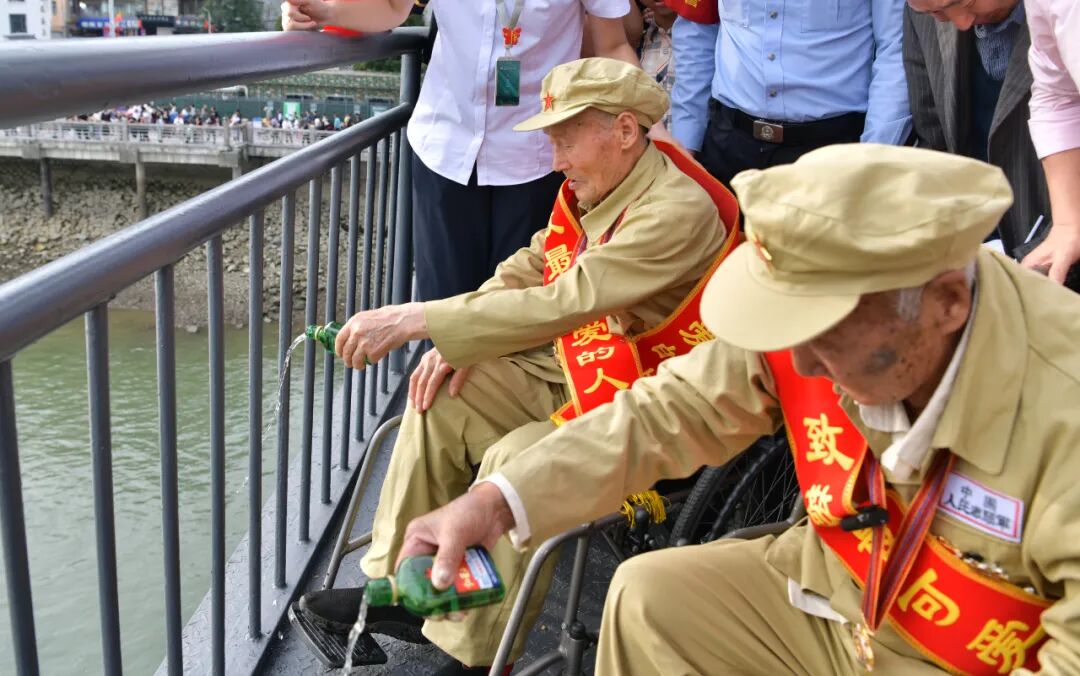 行至桥中,两位老战士神情庄重地将月饼投入江中、将白酒洒向水面,以这种传统而深情的方式,祭奠长眠于异国他乡的战友们。这一刻,滚滚江水仿佛承载着70多年不变的思念与敬意,流向远方。
