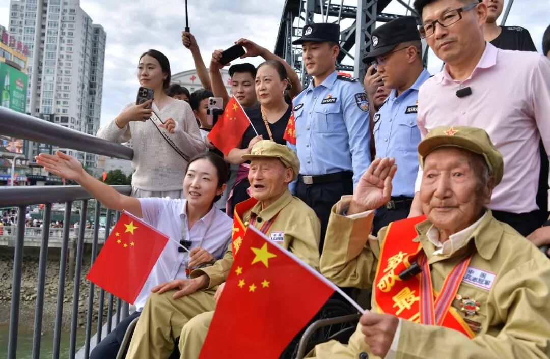 “雄赳赳,气昂昂,跨过鸭绿江……”祭奠之后,两位老战士与来自各地的游客不约而同地齐声高唱《中国人民志愿军战歌》。激昂的旋律在江面上回荡,历史的记忆与当下的情感在此刻交织。游客们被眼前的场景深深打动,纷纷驻足,向两位老英雄表达由衷的敬意,现场气氛庄严而感人。