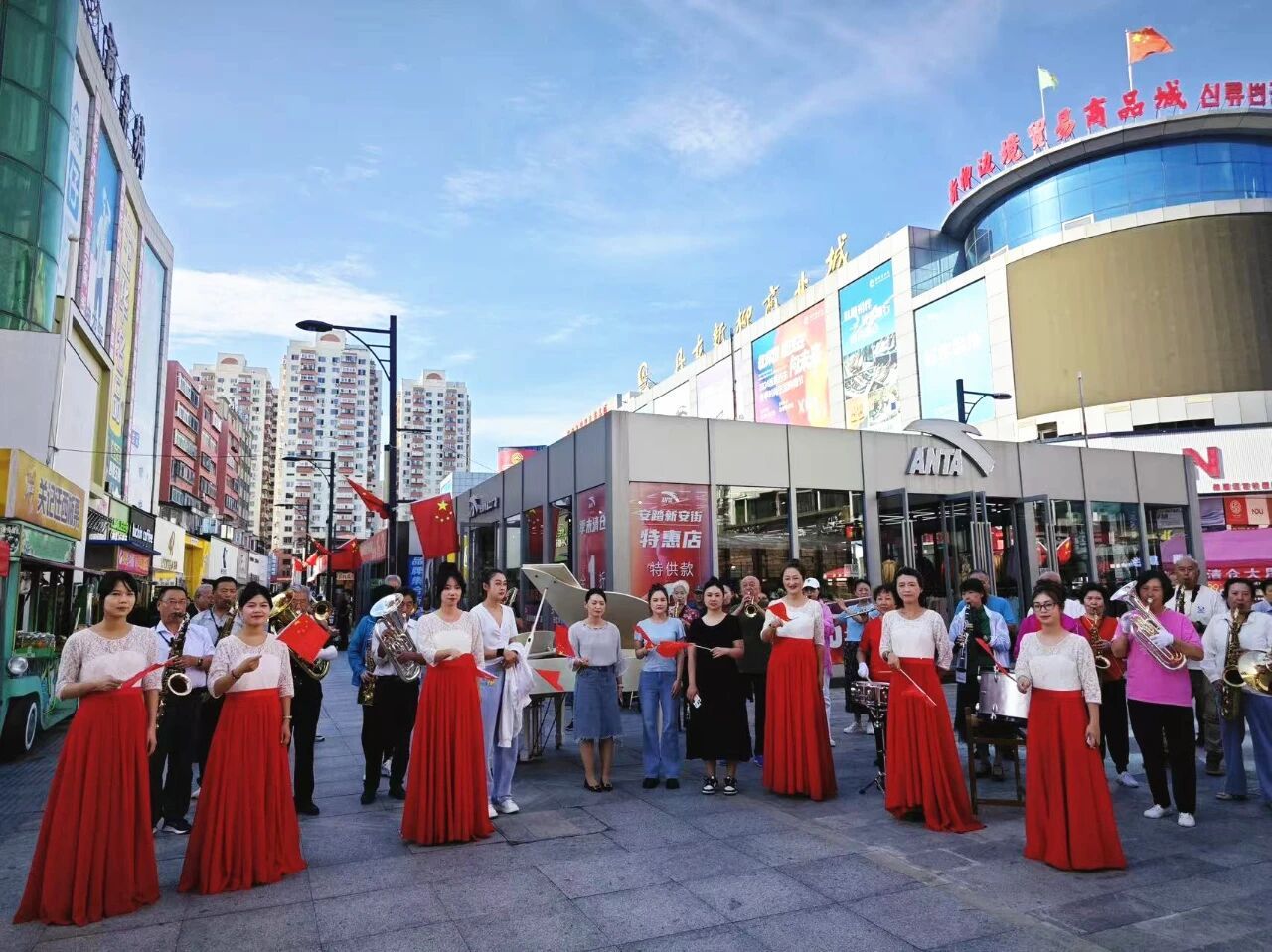在新安街,一场突如其来的快闪活动吸引了众多游客和市民驻足,熟悉的红色旋律通过器乐与合唱重新演绎,瞬间点燃了现场气氛,人们情不自禁地跟着哼唱,手中挥舞的国旗连成一片红色的海洋。