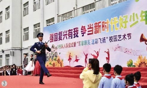 永昌街小学在建队日当天聘请“九三”阅兵空军方队护旗手徐诗萌担任校外辅导员。他结合自身阅兵经历激励广大少先队员,“磨破的鞋底、湿透的军装,都是对祖国的忠诚。希望你们以红领巾为荣,立大志、强本领!”铿锵话语点燃了在场学生的强军梦。