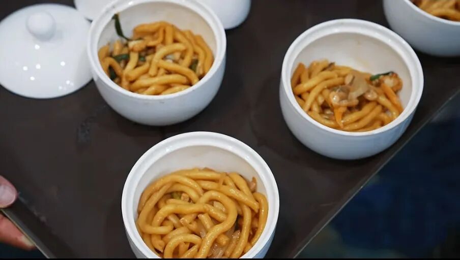 丹东特有的黄蚬子肉质鲜嫩,与筋道爽滑的传统(米叉)子同锅翻炒,(米叉)子裹着海鲜的鲜香,入口层次丰富,酸得开胃、鲜得地道。百位品鉴官细细咀嚼,频频点头称赞。