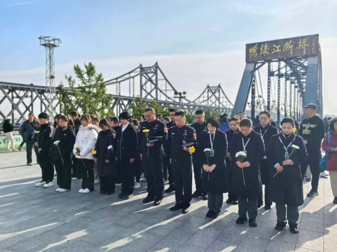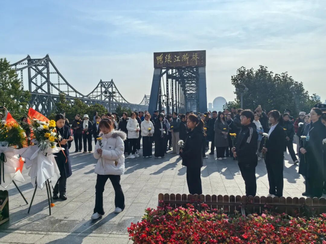 9点30分,景区工作人员、商旅边境派出所民警、辽东学院纺织服装学院师生、游客向英雄群雕鞠躬,敬献花束,以此纪念在抗美援朝战场壮烈牺牲的志愿军先烈。