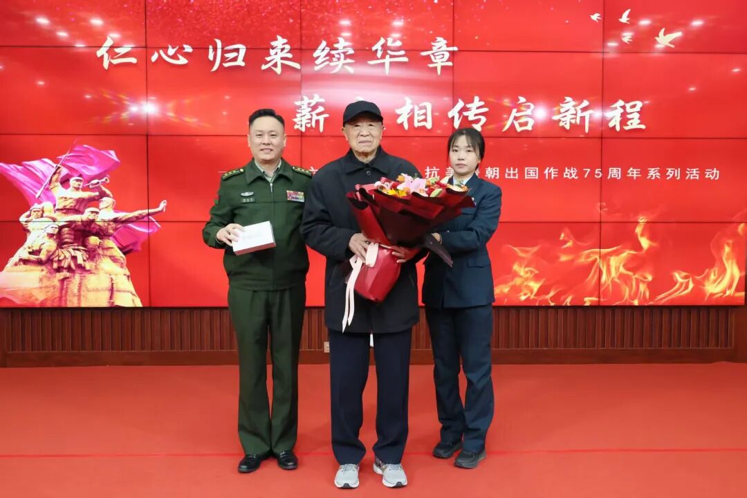 在“向前辈致敬”环节,医院领导为返院老专家颁发纪念章、献上鲜花。沉甸甸的纪念章,镌刻着老专家们数十年如一日的医者坚守,承载着医院对前辈们无私奉献精神的崇高敬意。志愿军老战士、丹东军分区原副司令员姚广仁深情回顾了抗美援朝战争前线的难忘经历,叮嘱年轻一代要牢记历史、坚守初心。