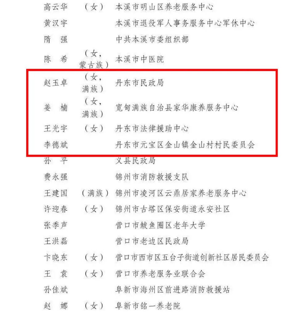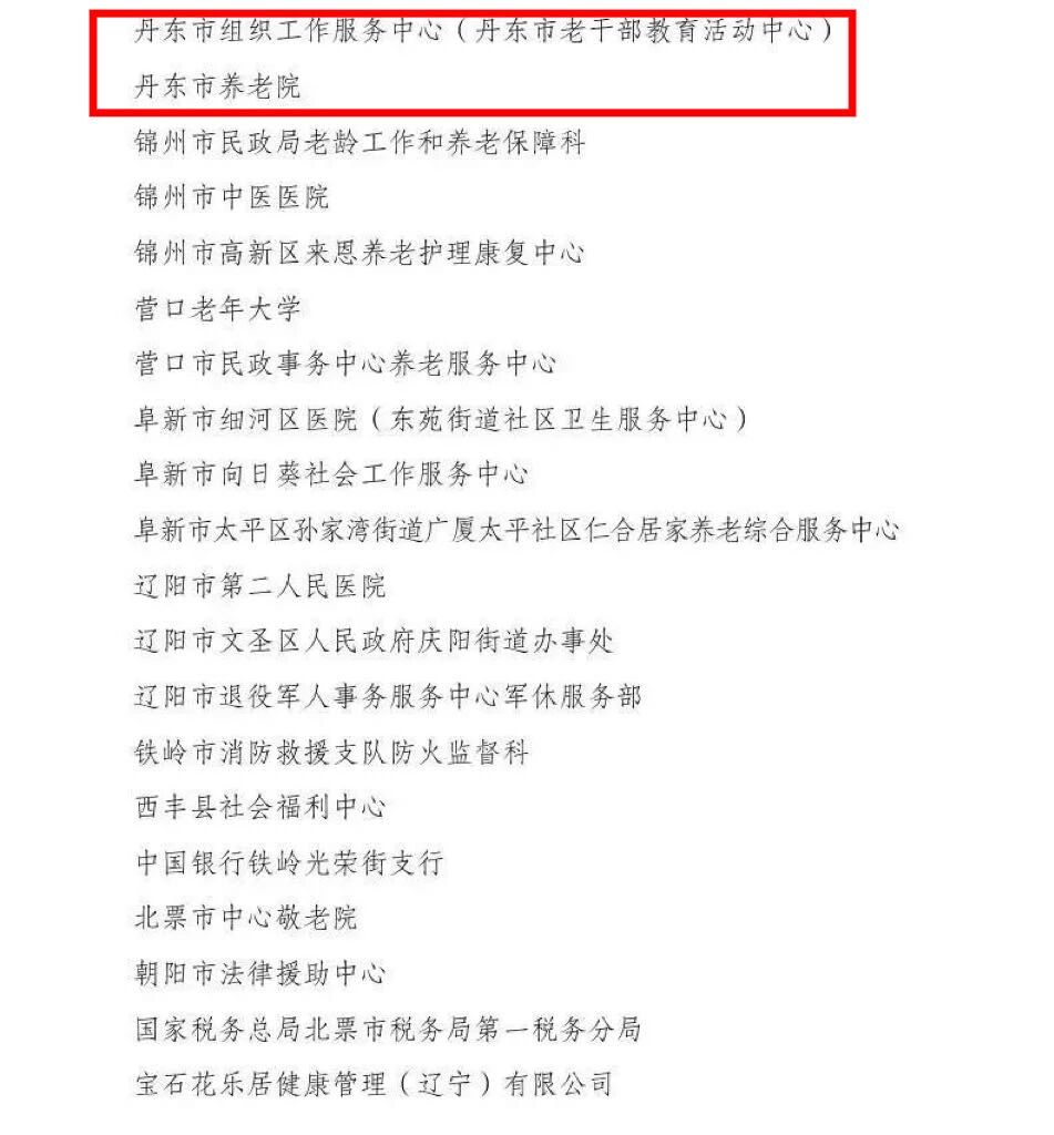 10月29日,全国老龄工作委员会办公室发布关于表彰全国“敬老文明号”和全国“敬老爱老助老模范人物”的决定。辽宁共有48个集体获全国“敬老文明号”称号,其中丹东有2个集体;73名个人获全国“敬老爱老助老模范人物”称号,其中丹东有4名。