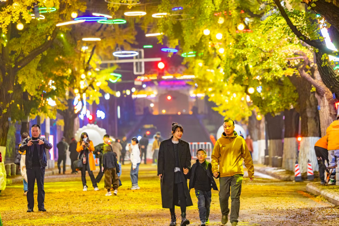 夜幕降临后,城市灯火与金黄银杏叶交相辉映,七经街、九纬路等核心路段化身浪漫打卡地,吸引市民与游客争相定格这份秋日限定美景。