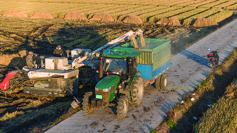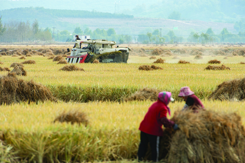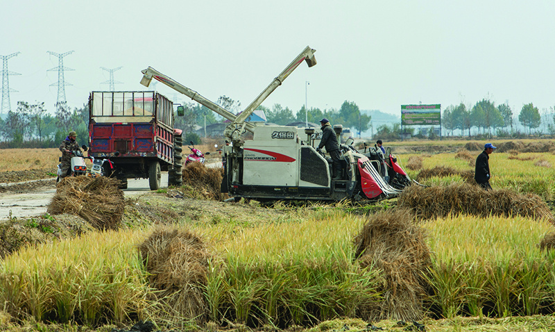 一串串饱满的稻穗被卷入收割机,经过脱粒、筛选后,金黄的稻种源源不断地被装入运输车,田间一派繁忙有序的丰收景象。