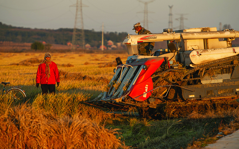 田间地头,数台大型收割机隆隆作响,在金色的稻浪中往复穿梭。
