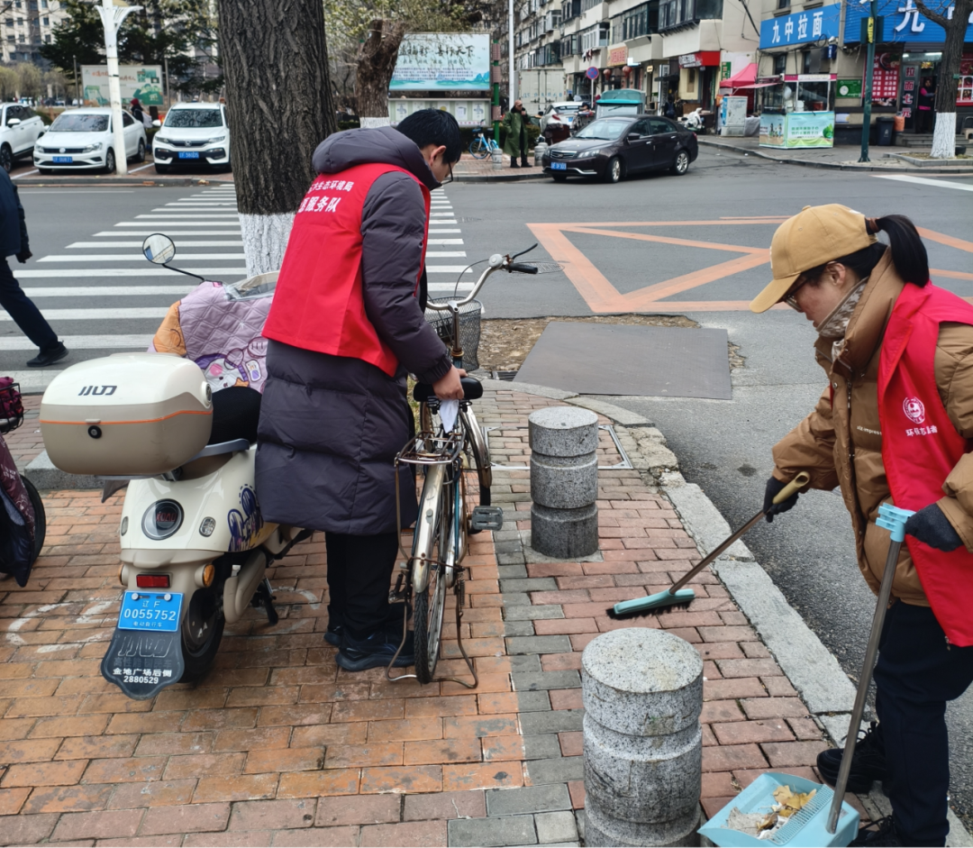 在四街社区,市直机关工委党员干部认真清扫路面垃圾、清运银杏落叶,规范摆放乱停乱放的单车,清除墙面及楼道小广告,用实际行动擦亮社区环境“底色”。