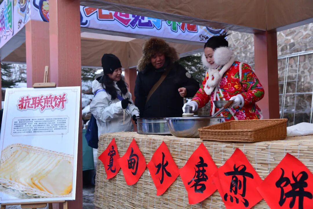 滑雪大厅外的“地道宽甸味”美食市集香气扑鼻,铁锅炖、煎锅、酸汤子等特色美食现场制作,浓浓东北冬日烟火气。