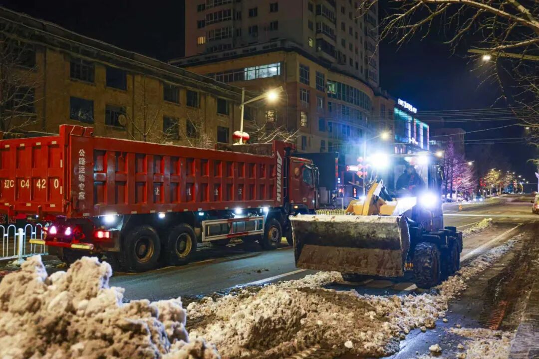 寒夜中,橘色身影与铲车灯光交织,成为街头最温暖的风景线。经过连夜奋战,辖区内道路积雪得到有效清除。