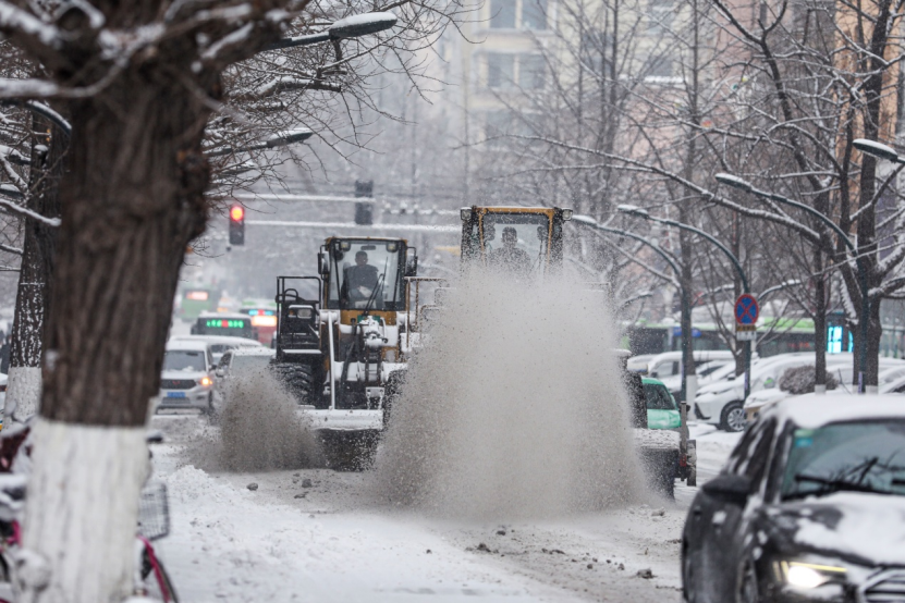 在十纬路、六纬路等主要道路,市政部门对道路布撒除雪剂,并进行除雪作业。