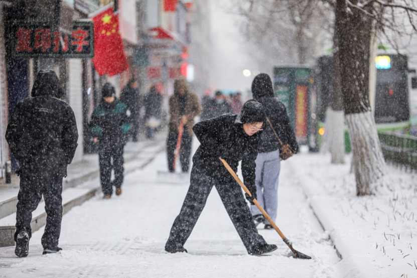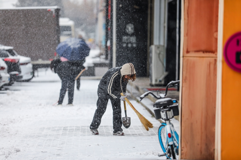 街边的商户们清理门前积雪。