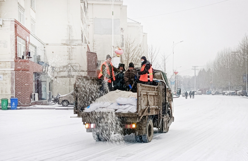 五龙背镇城管所及时对主要道路、铁路下穿路口等重要区域抛撒融雪剂,保证道路通畅、行人出行安全。