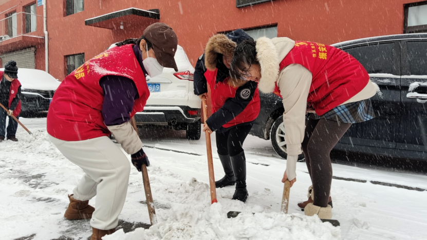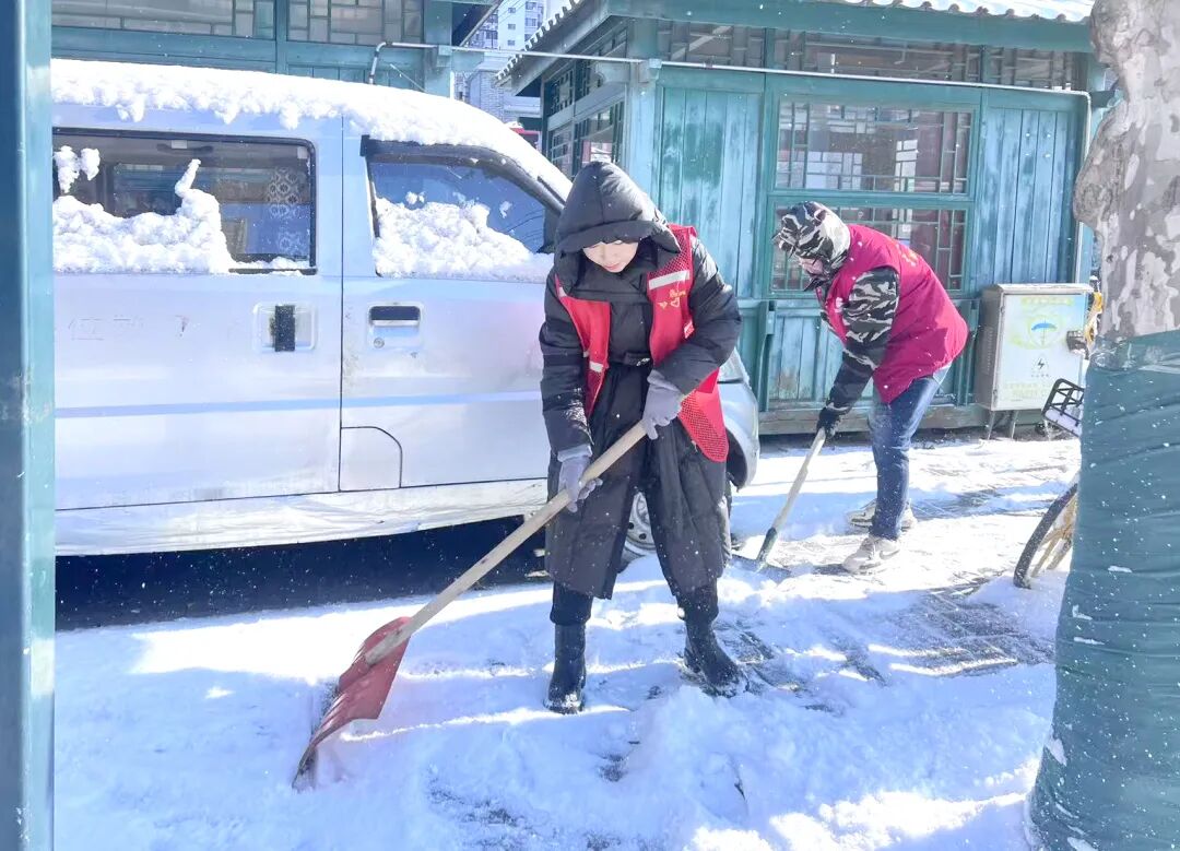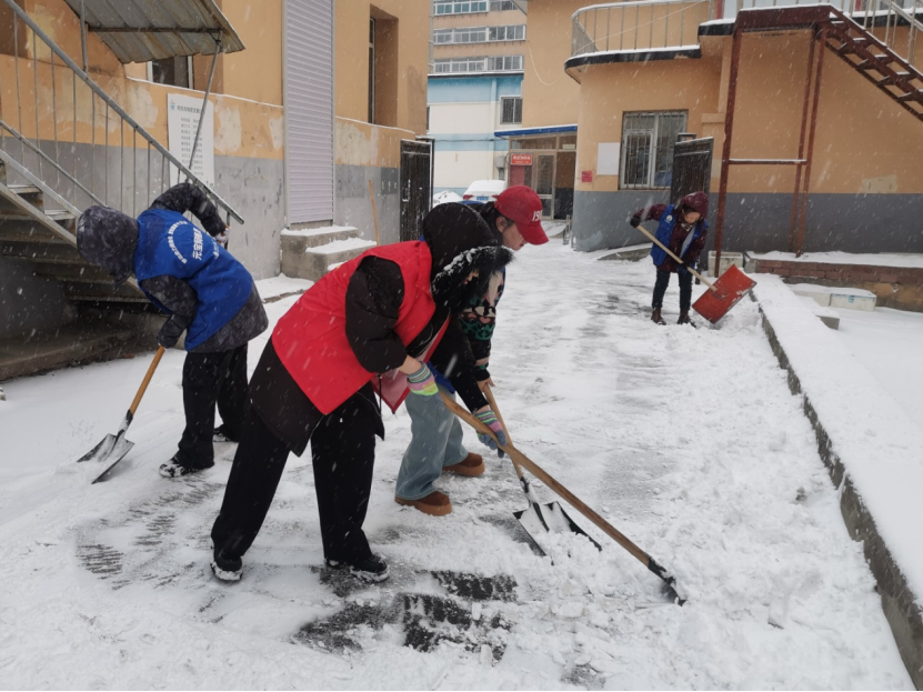 振兴区纤维街道黄海社区迅速组织工作人员、志愿者及居民开展扫雪除冰作业。