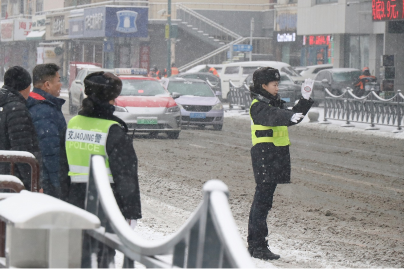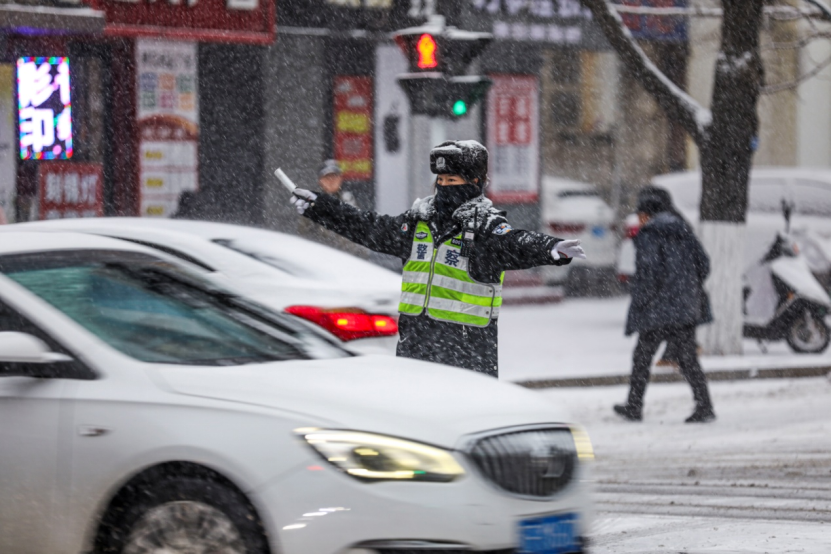 交警在各路口冒雪指挥交通。