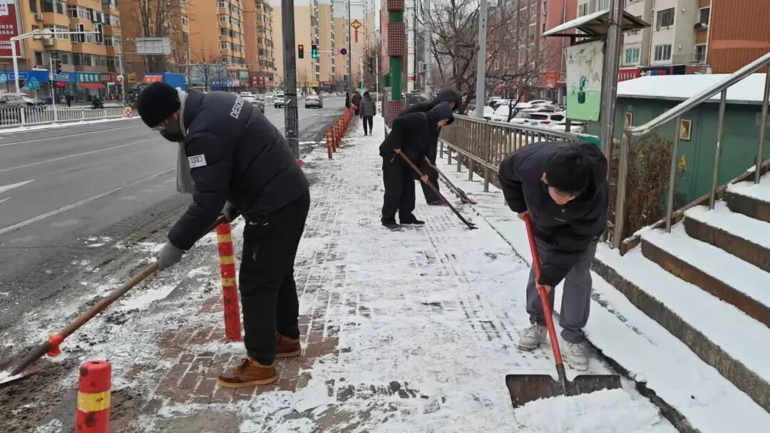 兴区纤维街道黄海社区工作人员与居民志愿者自发清理居民小区积雪,营造干净、整洁、安全的生活环境。