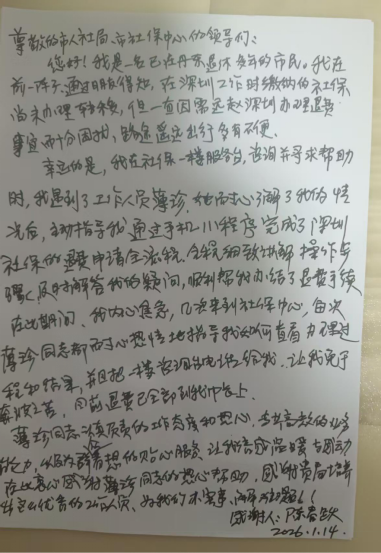 陈先生在信中特别写道:薄珍同志认真负责的工作态度、专业高效的业务能力,以及为群众着想的贴心服务,让我倍感温暖。