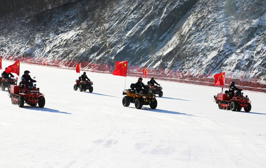 在宽甸满族自治县的天桥沟滑雪场,“2025—2026丹东冰雪温泉莓好欢乐季”启幕。图为雪地摩托表演。