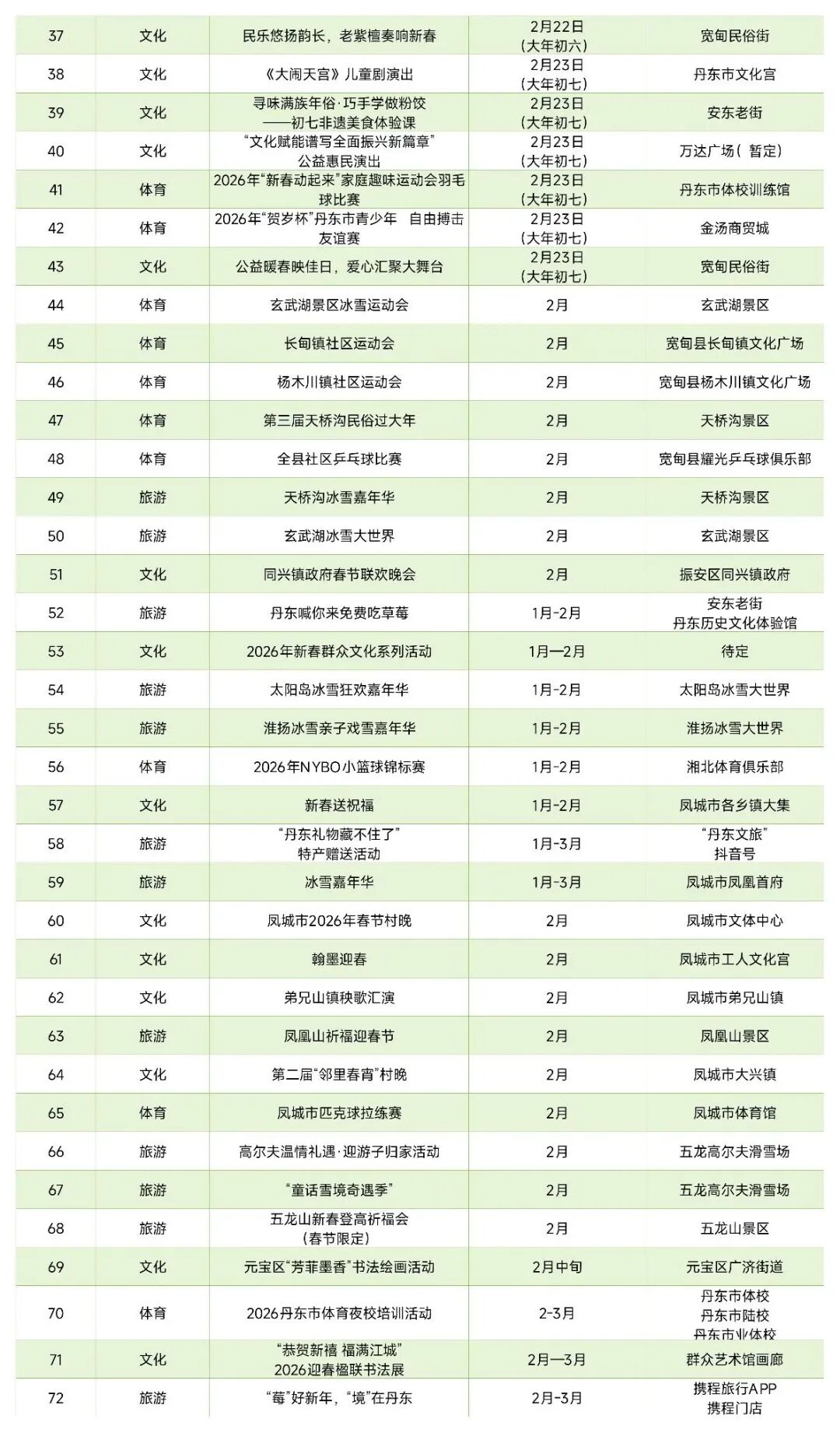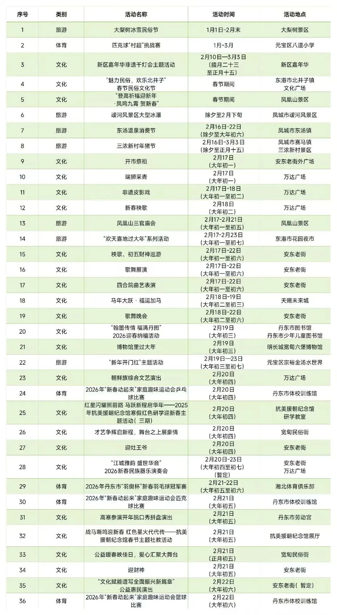 👉体育赛事活力爆棚。2026年“新春动起来”家庭趣味运动会热力开赛,大年初四至初七陆续推出乒乓球、匹克球、篮球、羽毛球四项赛事,邀家庭组团齐参与;2026年“羽奥杯”新春羽毛球冠军赛、2026年“贺岁杯”丹东市青少年自由搏击友谊赛、2026丹东市体育夜校培训活动接连上演,竞技与趣味兼具。