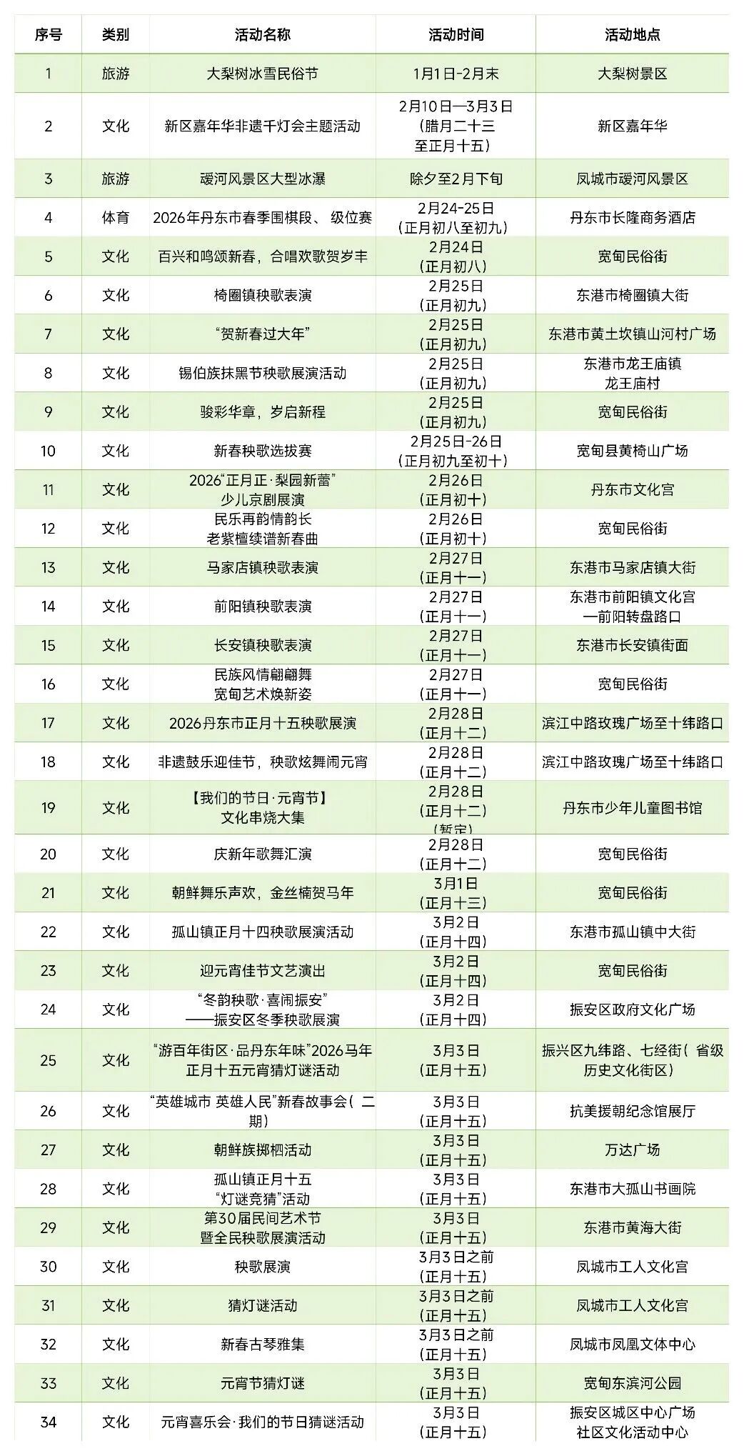 👉凤城市元宵节秧歌汇演、猜灯谜活动、新春古琴雅集呼应元宵主题;大梨树冰雪民俗节、叆河风景区冰瀑持续开放,赏景与民俗兼顾。