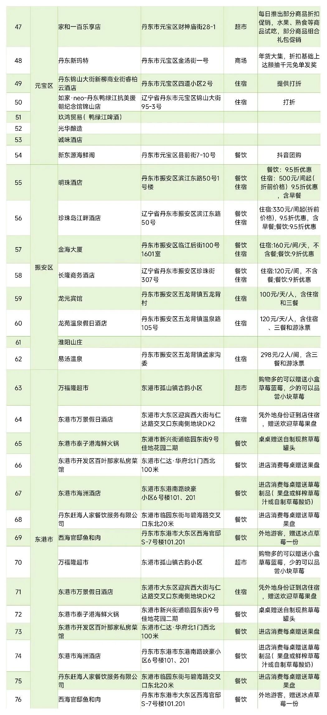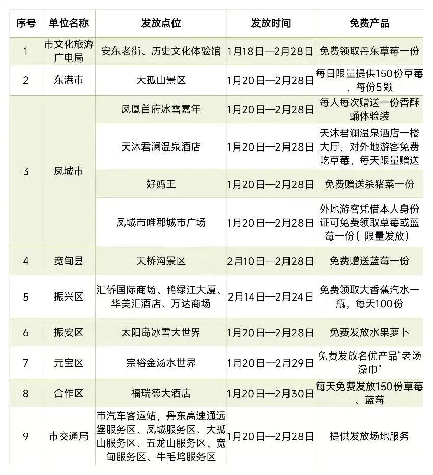 第一弹推出的近百项促消费举措热度持续,“丹东喊你来免费吃草莓”活动更是反响热烈,获全市各地区、各部门大力支持,升级为覆盖全域的冬季促消费活动!活动整合丹东草莓、蓝莓、大香蕉汽水、水果萝卜、香酥蛹、老汤澡巾等9大特色优品,吸引近百家商户积极响应,在景区、商超、酒店、交通枢纽等场景布局22个免费发放点位,将持续发放至2月底。