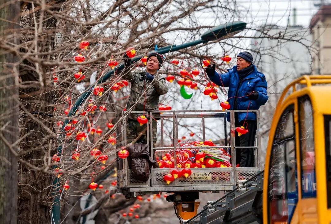 寒风中,红彤彤的灯笼经工作人员之手,依次“绽放”在银杏枝头,将冬日的萧瑟驱散,把新春的暖意传递。