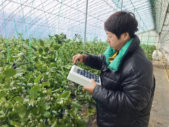 “2020年公司成立之初,我们就引进了水肥一体化智能灌溉系统。这个系统可以定点、定时、定量给蓝莓树施肥、灌水,保证每株苗木水分和养分供给基本一致,有效提升了蓝莓的品质。”丹东超群农业有限公司经理宋晓伟边操作系统边介绍。该公司位于杨木川镇大安平河村,建有蓝莓暖棚90栋、冷棚60栋,占地面积1500亩,以绿色、高效的现代化种植模式为主,同时在技术管理、包装、冷藏等关键环节加大投入,实现可持续发展。“1月中旬,基地的暖棚蓝莓就已经上市了,采摘期可持续到6月初,年产量80万斤左右,正好和冷棚蓝莓无缝衔接。”宋晓伟说。产业发展的红利,也源源不断地惠及周边群众。该基地常年为周边村民提供种植管理、修剪养护、采摘分拣等岗位400余个,优先吸纳脱贫户和留守妇女就业,让大家在家门口就能就业,实现稳定增收。