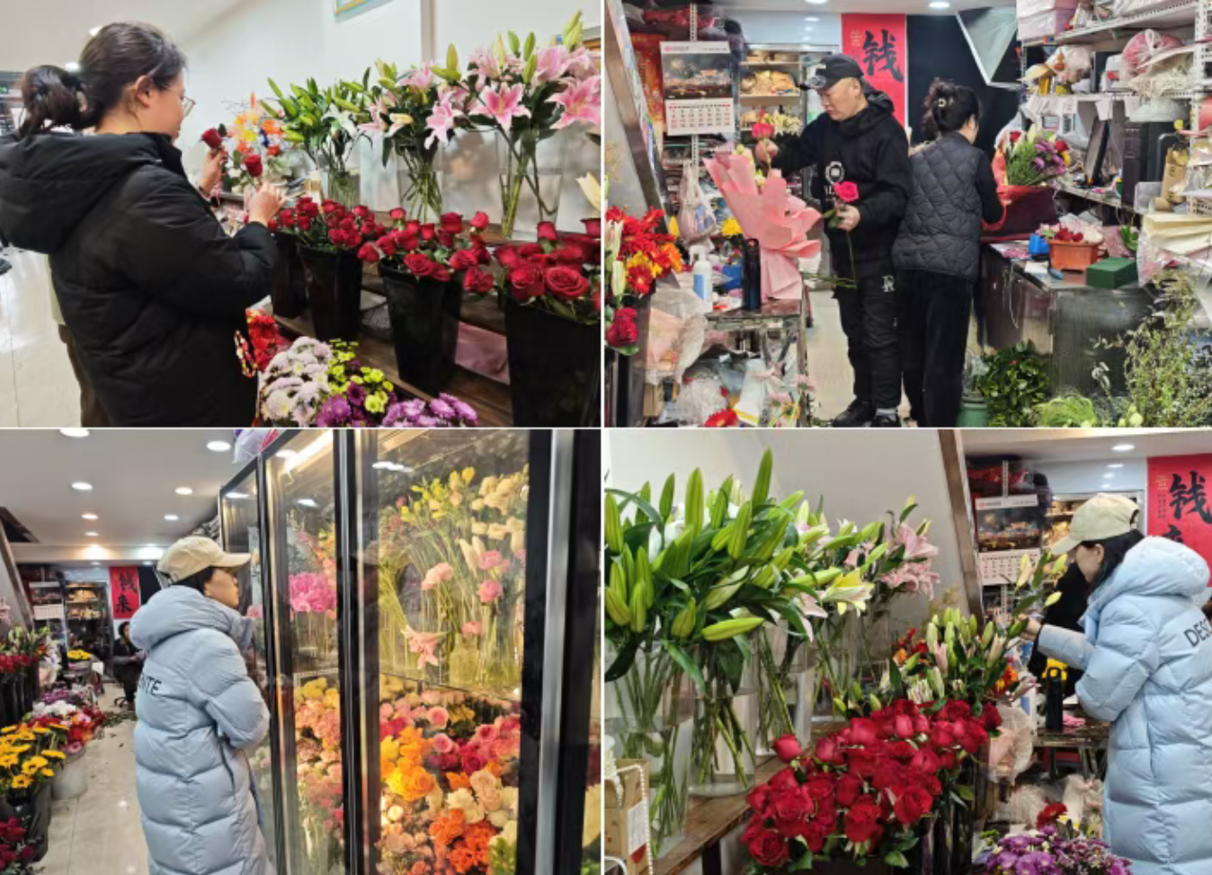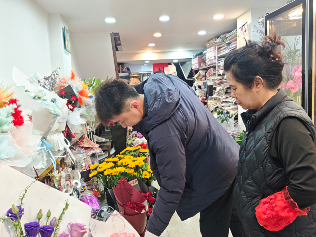 蝴蝶兰、银柳、百合、向日葵等花竞相绽放,红粉相映、鲜艳明媚,将节日氛围拉满。店内客流不断,市民或精心挑选花束,或咨询花艺搭配,或选购组合盆栽,处处洋溢着热闹与欢喜。