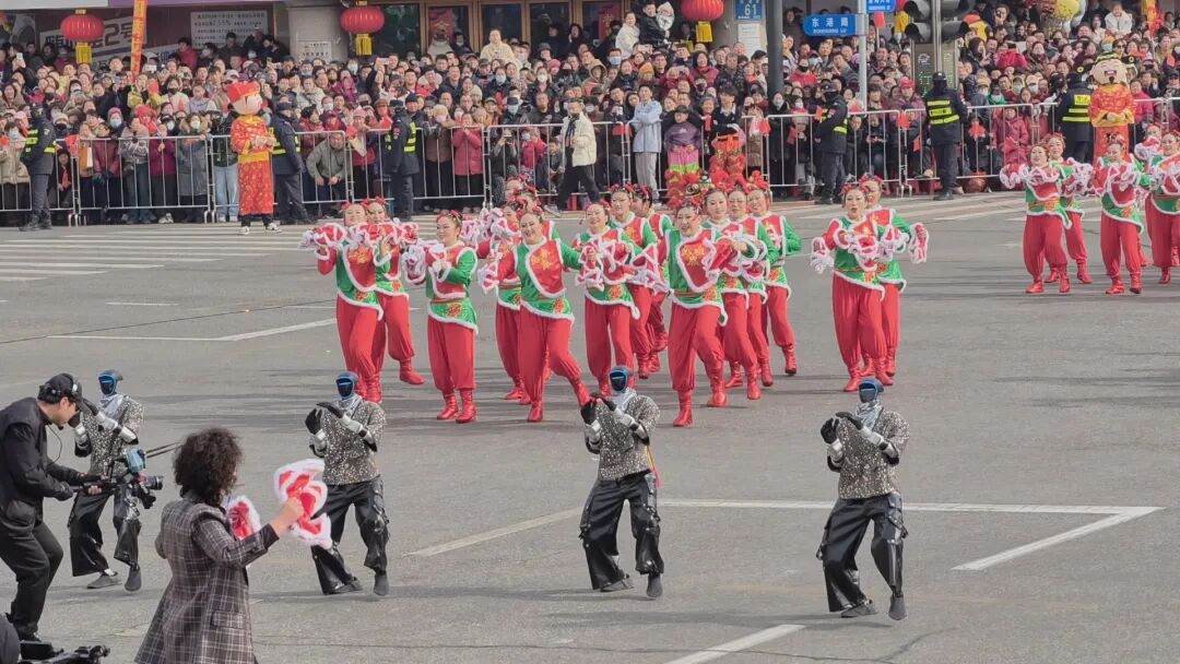 十字街镇秧歌队率先出场,队伍前的机器人成为全场亮点,它们踏着精准的机械舞步,与传统秧歌韵律奇妙交融。