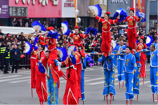 新城街道“龙马新渔耕”秧歌队粉裳映霞、彩扇生风,演员们随旋律振臂起舞,以龙马之姿展新城风采。