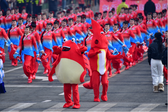 菩萨庙镇、海洋红农场联队跟随“古老木船”扬帆起舞,用生动表演展示耕海牧渔的地域特色。