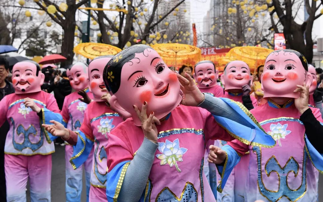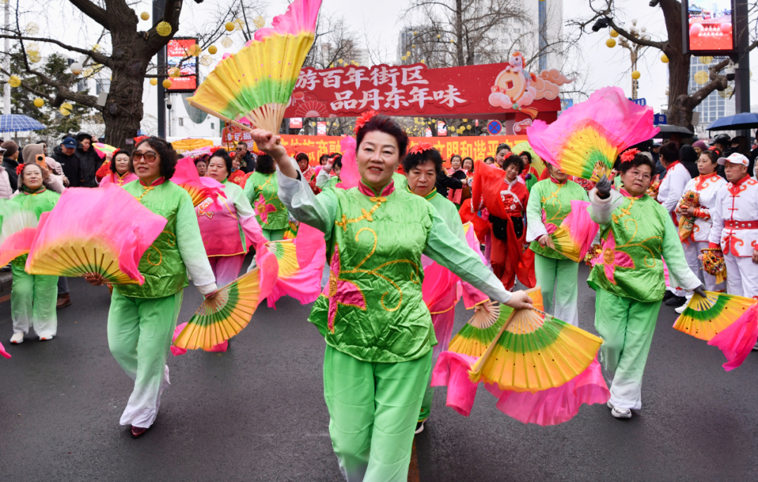 文艺汇演结束后,秧歌展演队伍身着盛装从杜鹃广场出发,沿着九纬路踏歌而行。铿锵锣鼓、灵动舞姿吸引市民游客驻足观看、拍照互动。“在家门口的百年街区看秧歌、闹元宵,氛围感直接拉满。”和家人同来的市民刘女士笑着说。