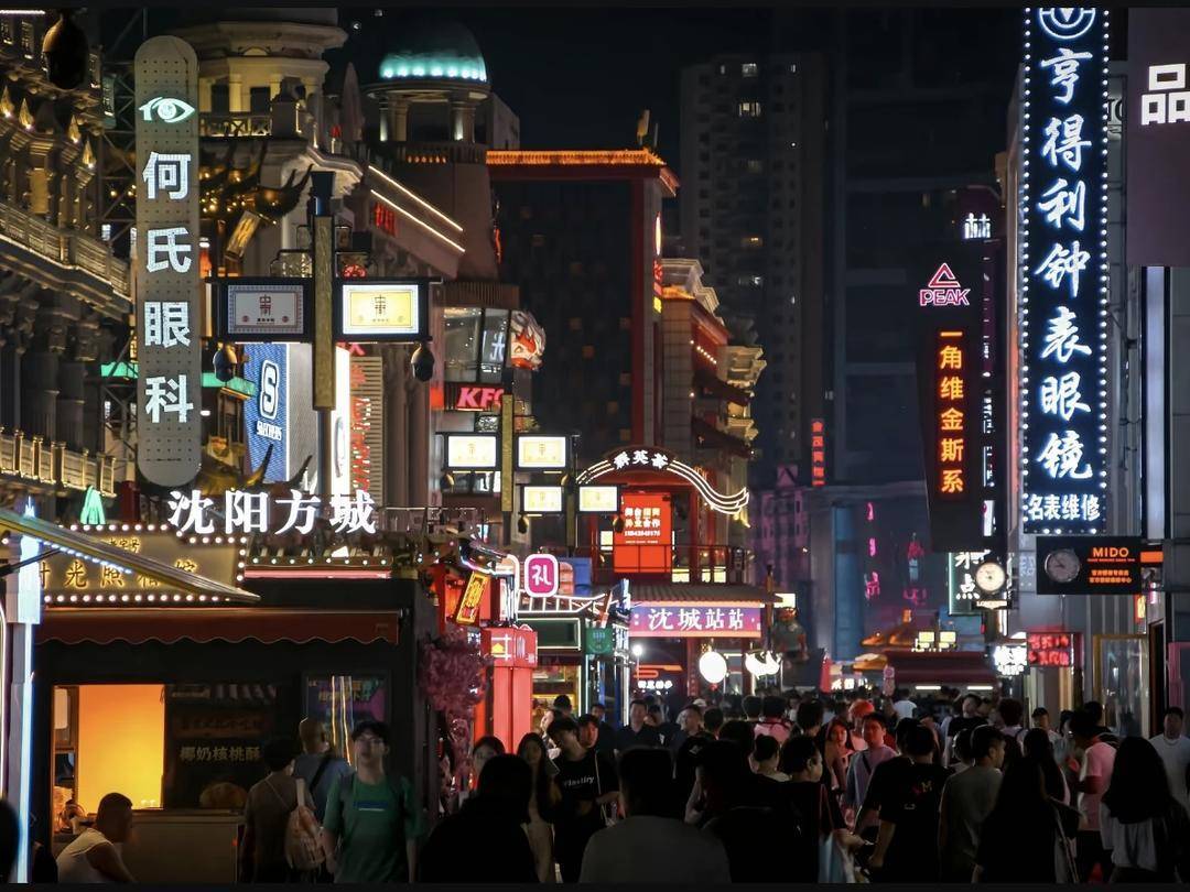 随着人流转至“第二站”——沈阳中街,这里的夜色呈现出另一番风味。霓虹灯为沿线老建筑勾勒出闪亮轮廓,沿街橱窗透出暖光,悄然洒在行人笑眯眯的脸庞上,共同织就沈河最热闹的夜的画卷。