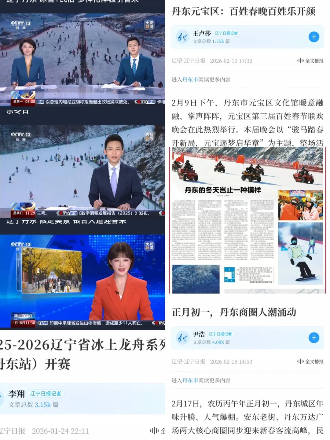 省级以上主流媒体围绕丹东冬季文体旅亮点,累计刊发深度报道62篇。其中,央视新闻9次将镜头对准丹东,记录“冰雪+民俗”的火热场景与冰雪赛事的蓬勃活力;新华社2次报道“冰雪温泉莓好欢乐季”活动盛况,将丹东的冬日热情传向全国。透过这些报道,丹东正用实际行动证明,“冰天雪地”正在加速转化为“金山银山”,成为冰雪经济发展的生动注脚。