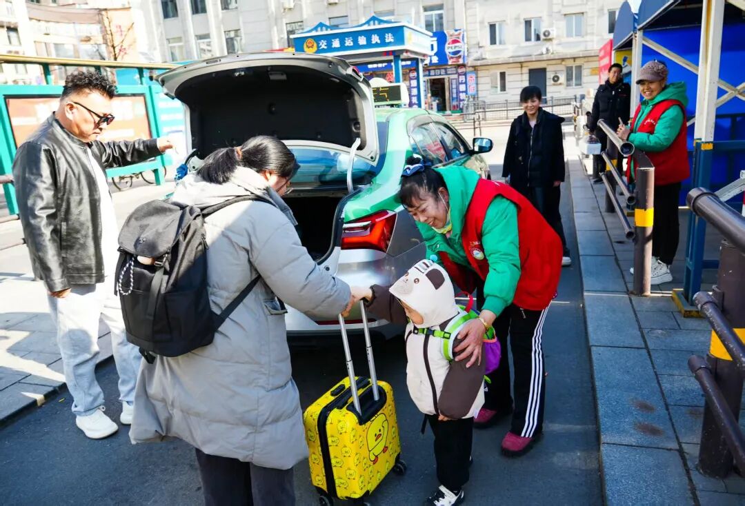 志愿服务队队长付忠文的脸颊被风吹得微微发红,双手却不停歇:“大娘,我帮您拎箱子,这边出站,慢点儿走!”他帮旅客扛起沉重的行李,朴实爽朗的话语抚平了旅途的疲惫。
